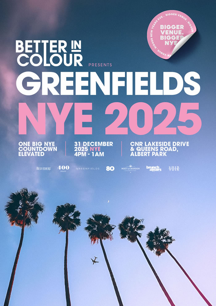Better In Colour returns with a spectacular all-day and night New Year's Eve celebration at Greenfields, Albert Park — bringing panoramic lake views, a premium open-air atmosphere and a vibrant all-in-one experience as Melbourne counts down to 2026. Alongside two hours of complimentary drinks and roaming canapés, the event also offers exclusive booth packages for those wanting an elevated VIP celebration, creating a brighter, bigger and unforgettable NYE set against the city skyline.